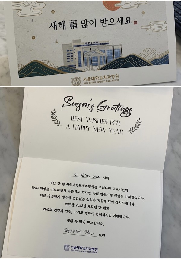 23-01-11 | 서울대치과병원에서 온 연하장 2023 계묘년을 맞이하여 서울대치과병원에서 김진철 원장님께 연하장을 보내주셨습니다^^덕분에 행복한 마음으로 하루를 시작하게 되었습니다. 김진철 원장님께서는 현재 서울대학교 치과병원 겸임교수로 출강하고 계십니다. 새해는 더욱 건강하고 활기찬 한 해가 되기를 소망합니다. 이전글 다음글 목록