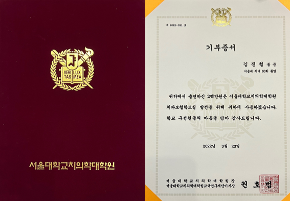 모교인 서울대학교 치과대학의 발전을 위해 발전 기금을 후원하였습니다.