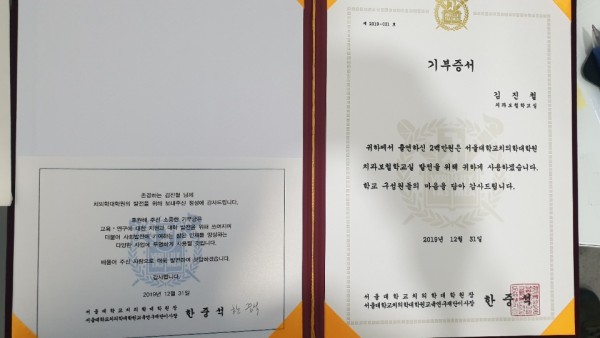 모교인 서울대학교 치과대학의 발전을 위해 발전 기금을 후원하였습니다.
